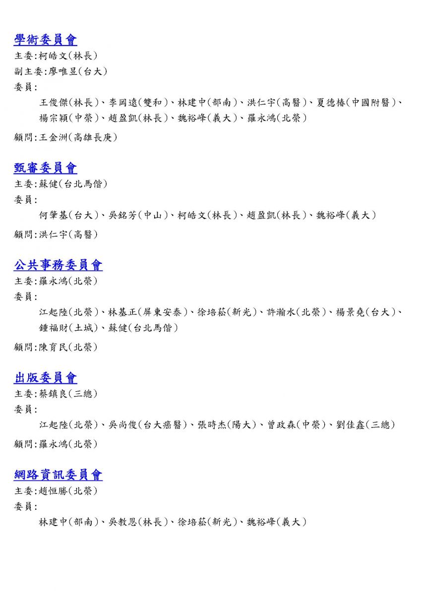 | 監事 | 蔡俊明 | 臺北榮總腫瘤醫學部教授顧問 |